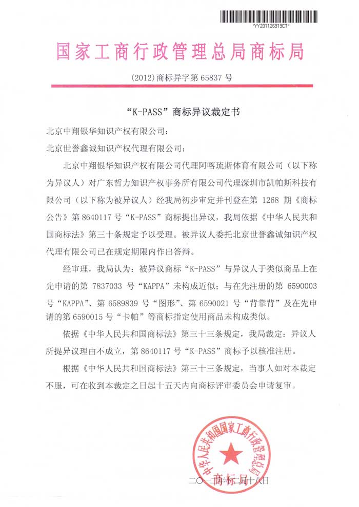 “K-PASS”商標(biāo)異議裁定書