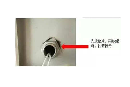 ④在閘機下方,將線纜及線纜接口依次穿過墊片、螺母,將螺母對準(zhǔn)螺紋擰緊,如圖所示。