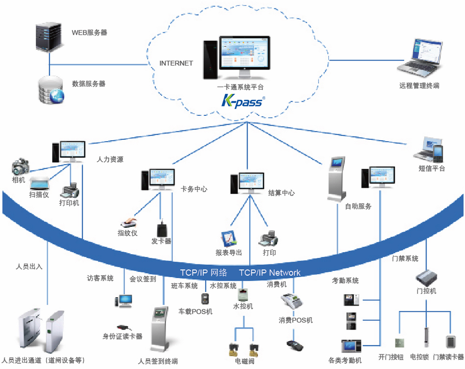 K-pass 非接觸式智能卡考勤系統(tǒng)由前端專用考勤管理設(shè)備及計算機管理軟件組成:專用考勤設(shè)備內(nèi)置讀卡器等識別設(shè)備,對進(jìn)出的人員進(jìn)行身份識別,并紀(jì)錄個人的出入時間、考勤數(shù)據(jù)等,實現(xiàn)考勤控制的智能化管理;系統(tǒng)操作員在后臺計算機上,監(jiān)控各個考勤點的考勤情況,對數(shù)據(jù)庫進(jìn)行管理。前端控制設(shè)備通過纜線與PC機的串口相連,實現(xiàn)與PC機的數(shù)據(jù)傳輸。并且當(dāng)距離較遠(yuǎn)時,可通過外接MODEM,并通過電話線進(jìn)行數(shù)據(jù)的傳輸。